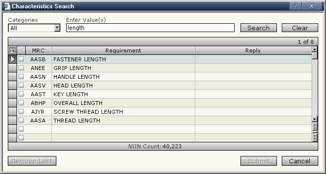 The next step is to click the key list entry "Characteristic Lookup" to enter into the Characteristic Sub-Search dialog. All 95 relevant MRCs are displayed. Filtering the list for MRCs related to "Length" reduces its size to a more manageable number of entries.