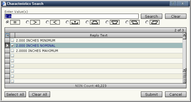 LogiQuest refines the list and returns the "2 inch" catalog values. We check the value that is exactly two inches and click "Submit" to process our choice.